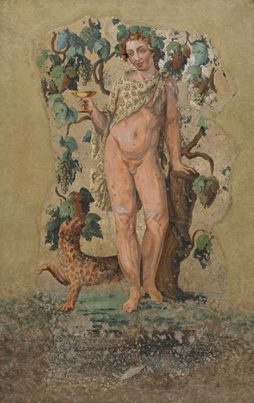 Dionysos viinimalja kädessään, viiniköynnösten ympäröimänä, pantteri jaloissaan. Seinämaalaus Pompeijista 100-luvulta eaa.