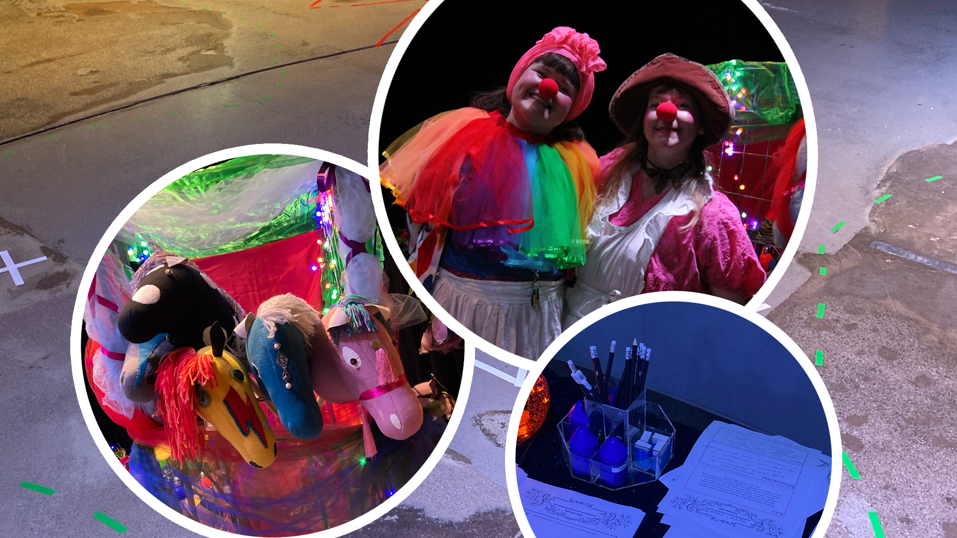 Klovniduo Hertta ja Martta lukevat päivän aikana syntyneitä sirkussatuja.
