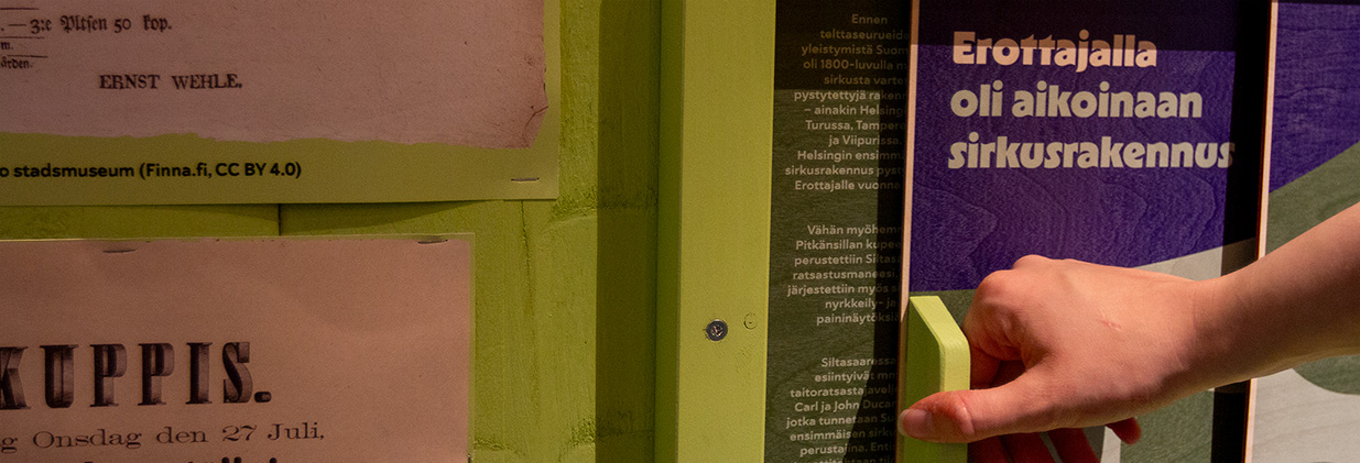 Huimaa! Sirkuksen taikaa ja tarinoita -näyttelyn opastus vie matkalle suomalaisen sirkuksen historian eri aikakausiin ja muotoihin alkaen 1800-luvun kiertävistä seurueista aina nykypäivän kansainvälisiin nykysirkustaiteilijoihin asti.