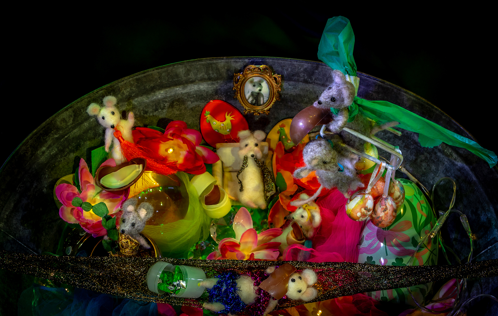 Kuiskaajahiiri oli kutsunut hiirisukulaisensa pääsiäisen viettoon kotiinsa Teatterimuseoon. Sukulaisia saapui Suomen eri teattereista ja museoista, ja nälkäisinä he päätyivät herkkuja notkuvan pöydän ääreen. Suklaamunia syötiin niin innokkaasti, että sokerihepulissa hiiret sinkoilivat ympäri museota. Nyt heitä ei löydy mistään!