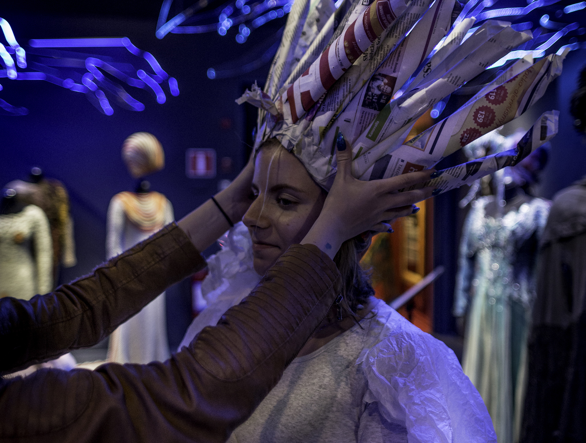 Työpajan kulku: Paja alkaa näyttelyn pukuihin tutustumisella. Sen jälkeen osallistujat suunnittelevat ja toteuttavat pienryhmissä teatteri/esityspuvun ryhmän yhden osallistujan ylle. Puvun rakentamiseen käytetään sanomalehteä ja muita kierrätysmateriaaleja, teippiä ja nitojaa. Puvut ja suunnitteluryhmät esitellään näyttämöllä, jossa luodaan puvulle sopiva tai vastakkainen valo- ja äänimaisema.