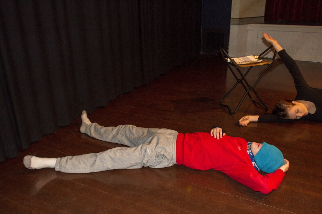 Venyttelyä. Menkää lattialle makaamaan. Jokainen etsii itselleen paikan, jossa on hyvä olla. Sulkekaa silmät. Pyörittele hartioita, kurottele käsillä kattoon, venytä kyljet, pyörittele päätä, potki rennosti jaloilla. Paina selkää lattiaan. Käykää samalla mielessänne läpi esityksen järjestystä, kohta kohdalta.