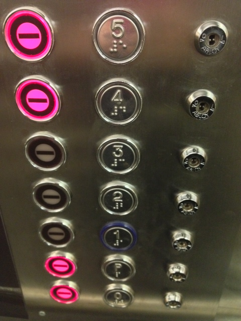 Välilä tuntuu että miksi, miksi näin, miksi tehdä kaikki alusta asti itse, ryhmälähtöisesti? Onhan se raskas työtapa, mutta palkitseva kyllä joo. Mukaan hiipii jossain vaiheessa kuitenkin puristavakin paine siitä, että tästä tulee esitys (voi tietysti päättää, että esitystä ei tehdä). Prosessi on tärkeä ja esitys on prosessin tulos. Mutta silti, esitys ja siihen liittyvät paineet. Jos on ollut hyvä prosessi, voiko esitys olla silti huono? Tai päinvastoin? Esitys on prosessinsa näköinen, vai onko? Kaaoksessa ollaan, jollain lailla hallitussa kylläkin, ja onhan se hieno tila. Katson päivittäin hissin nappuloita, hissillä on merkitys myös esityksessämme. Se kuljettaa ja yhdistää kaksi eri maailmaa. Hissin paneelissa on selkeä järjestys, selkeässä rivissä. Lukittuihin et pääse ja jos painat nappia se menee aina sinne minne haluat. Ei improile hissi matkalla että ”Ha haa tänään ykkönen onkin kakkonen ja ei huvita mennä tänään nollaan ollenkaan, mitäs tästä syntyy!”. Joskus toivoo että elämä tai esityksen rakentaminenkin menisi niin, mutta se käy pienen hetken mielessä, silloin kun on sekavaa. Sitten se jo unohtuu ennalta arvattavuudessaan. Devising-menetelmäopas Labrassa napit ja etenemisjärjestys on myös merkitty, jonkinlainen polku annettu. Toivon kuitenkin polulta poikettavan, sillä en minä voi mitään valmista antaa. Ideoita kyllä omista ja ryhmämme kokemuksista. Otan kuva hissin nappuloista.