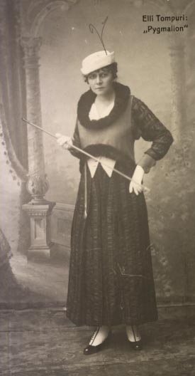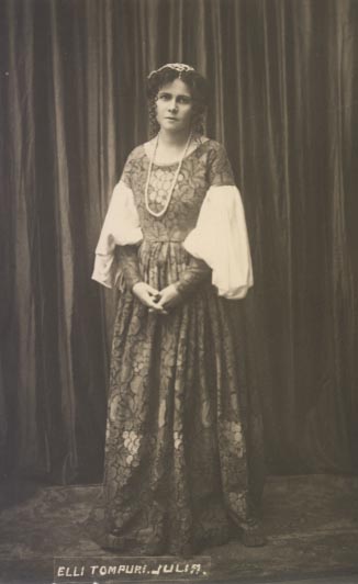 Elli TompuriHei! Minä olen Elli Tompuri, eli varsinaiselta nimeltäni Elin Hulda Maria Tompuri. Te voitte kutsua minua ihan Elliksi! Synnyin 20.1.1880 Vehkalahdella. Kävin oppikoulun loppuun Helsingissä ja pääsin ylioppilaaksi 1898. Olin jo kouluaikoina innostunut teatterista ja esiintymisestä. Varsinainen teatteriurani alkoi siitä, kun pääsin vuonna 1900 Suomalaisen Teatterin (josta sittemmin tuli Suomen Kansallisteatteri) näyttelijäharjoittelijaksi. Aluksi sain näytellä pieniä sivurooleja, mutta pikku hiljaa pääsin suurempiin osiin. Sain lisää kokemusta ja ammattitaitoa ulkomaisten opintomatkojen ja taiteilijakontaktien välityksellä. Näyttelin urani aikana suomeksi ja ruotsiksi, mutta myös saksaksi, englanniksi ja ranskaksi. Näyttelin 1903–1904 Svenska Teaternissa ja 1904–1905 Tampereen Teatterissa, jossa toimin lisäksi kevätkauden ajan johtajana. Urani suurena läpimurtona on pidetty nimiroolia Oscar Wilden näytelmässä Salome, joka esitettiin Suomen Kansallisteatterissa 1905. Salomea pidettiin tuohon aikaan rohkeana esityksenä, sen esittäminen oli kotimaassaankin Iso-Britanniassa kielletty. Seuraavana vuonna lähdin kiertämään Suomea, ohjelmistoon kuuluivat Salomen lisäksi Giovanni Vergan Talonpojan ritarillisuus ja Minna Canthin Sylvi. Opiskelin Wienissä ja esiinnyin Saksassa Lessingtheaterissa ja Kleines Theaterissa 1908–1910 välisenä aikana. Sitten tulin takaisin Suomeen. Vuonna 1910 menin naimisiin Lauri af Heurlinin kanssa ja meille syntyi kaksi poikaa. Pian tämän jälkeen, vuonna 1912, kokosin seuraavan oman kiertueeni, jonka ohjelmistoon kuuluivat nyt Henrik Ibsenin Nukkekoti, Franz Grillparzerin Medea ja ranskalainen komedia Ylimääräinen rouva. Ohjasin itse esitykset ja näyttelin pääroolit. Seuraavana vuonna (1913) tein uuden kiertueen, jolloin näyttelin muun muassa itse pääroolia William Shakespearen Hamletissa. Mieheksi pukeutuminen aiheutti kohua ja vastustustakin, mutta Hamletin pääosan tulkinta todettiin onnistuneeksi. Kolmannen kiertueen ohjelmistona 1915– 1916 oli Romeo ja Julia sekä Bernard Shaw'n Pygmalion. Laajan kiertuetoiminnan ansiosta sain kokemusta siis myös ohjaajana ja johtajana, välillä toimin puvustajana ja lavastajanakin. Kiertueiden välisenä aikana vierailin Kansallisteatterissa ja Kansan Näyttämöllä Helsingissä sekä Tampereen, Viipurin ja Turun teattereissa. Avioliittoni af Heurlinin kanssa päättyi eroon 1919. Samana vuonna perustin oman taiteellisen teatterini, Vapaan Näyttämön. Hain teatterini moderniin ohjelmistoon virikkeitä keskieurooppalaisista esikuvista. Olinhan matkustellut paljon ja myös näytellyt ulkomailla. Useat ohjaamistani esityksistä olivat suomenkielisiä ensiesityksiä, kuten August Strindbergin Kruunumorsian ja Aleksis Kiven Olviretki. Kaikki eivät pitäneet ohjelmistovalinnoistani. Uusi Suomi -lehden teatterikriitikko Jalmari Lahdensuo hyökkäsi rohkeaa ohjelmistopolitiikkaa vastaan hyvin henkilökohtaisin sävyin. Hyökkäysten kohteena olivat erityisesti esittämäni näytelmien seksuaalisesti vapaamieliset naishahmot: jo aiemmin tuttu Wilden Salome ja Frank Wedekindin Maahisen Lulu. Vapaan Näyttämön toiminta lakkasi ensimmäisen vuoden jälkeen taloudellisiin vaikeuksiin. Hankaluuksia tuli toiseltakin suunnalta: minuun alettiin suhtautua epäluuloisesti, koska aloin yhtenä ensimmäisistä taiteilijoista vierailla työväentaloissa vuoden 1918 sodan jälkeen. Työväenluokka oli sodan hävinnyt osapuoli, eikä heidän kanssaan olisi ollut hyväksyttävää veljeillä. Roolit, jotka olivat tehneet minusta kansallisen tähden, muuttuivat vuoden 1918 sodan jälkeisessä konservatiivisessa ilmapiirissä ei-toivotuksi toisinajatteluksi. Tunsin mahdollisuuteni Suomessa niin rajoitetuiksi, että lähdin vuonna 1924 kiertueelle Yhdysvaltoihin. Päätöstä edelsi lisäksi riitautuminen Suomen Kansallisteatterin johtokunnan kanssa sekä Suomen-kiertueen ristiriitainen vastaanotto. Ensimmäisellä kiertueellani Yhdysvalloissa esiinnyin suomalaisten siirtolaisten parissa. Ohjelmistossani oli Gustaf von Numersin Elinan surma sekä suomalaista runoutta. Kiertue oli menestyksekäs huolimatta esiintymispolitiikan aiheuttamasta kohusta, kotimaasta tuttu poliittinen tilanne kun päti myös siirtolaisten piirissä. Halusin tietysti esiintyä tasapuolisesti sekä porvariston että työväestön omistamissa taloissa ja siitähän ei tietysti pidetty. Toisen kiertueeni (1926–1927) suuntasin amerikkalaisiin kirjallisiin kerhoihin ja yliopistoihin. Luennoin Suomesta ja esitin Kalevalaa, Kanteletarta sekä Eino Leinon, Arvid Järnefeltin, Aleksis Kiven, J. L. Runebergin ja Uuno Kailaan tekstejä englanniksi. Koska valmiita käännöksiä ei ollut, tein ne itse. Kolmannella esiintymismatkallani 1928– 1929 ohjelmistona oli aiempien numeroiden lisäksi Shakespearea ja Strindbergiä. Ankarasta vuosien kestäneestä yrittämisestä ja lehdistössäkin esiintyneistä toiveista huolimatta minua ei enää kiinnitetty Kansallisteatteriin Amerikan-matkojen jälkeen, vaan sain tyytyä vierailemaan Kirsti Fleminginä Elinan surmassa sekä muissa rooleissa eri teattereissa. Innostuin lausumisesta ja järjestin useita, laajoja lausuntailtoja. Niiden kautta esittelin suomalaisyleisölle aivan uusia runomaailmoja: käännöksiä sukukansojen runoista, itämaista ja afrikkalaista runoutta sekä eskimo- ja intiaanirunoutta. Ohjelmistoon kuului myös suomenruotsalaisia modernisteja ja Eino Leinoa. Otin ohjelmistoon myös tuolloin vielä suhteellisen tuntemattomia aikalaismodernistien runoja, kuten Edith Södergrania ja Elmer Diktoniusta, joista myöhemmin tuli klassikoita. Vaikkei Kansallisteatteri hyväksynyt minua riveihinsä, nuori sukupolvi nosti minut esikuvakseen, ja uuden polven kulttuurivaikuttajat kirjoittivat minusta ylistäviä artikkeleita. Minuun liitettiin korkeakulttuurinen leima, sisälsiväthän esitykseni usein erilaisia tyylikokeiluja. Mutta samanaikaisesti minua pidett
